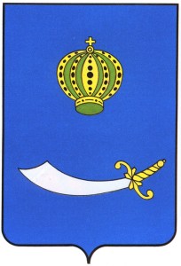 В лазуревом щите золотая корона на зеленой подкладке с пятью дугами и крестом сопровождается внизу серебряным мечом острием вправо с золотой рукояткой.