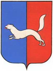 Щит рассечен: пробое поле лазуревое, левое червленое. Бегущая серебряная куница вправо. Глаза и язык червленые.