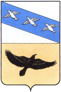 Щит пересеченный, Б верхнем серебряном, поле лазуревая перевязь справа, обремененная тремя серебряными летящими куропатками. В нижнем золотом поле летящий черный ворон влево.