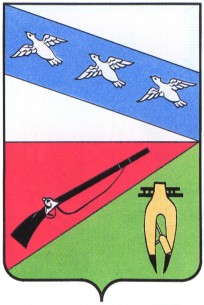 Щит пересеченный. В верхнем серебряном поле лазоревая перевязь справа, обремененная тремя серебряными летящими куропатками. Нижнее поле скошено слева. В верхней червленой части охотничье ружье натурального г$ета. В нижней зеленой части золотая соха.