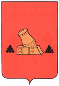 В червленом щите золотая мортира, сопровождаемая по сторонам пирамидами ядер натурального цвета.