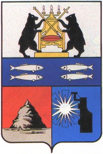 Щит пересечен и полурассечен. В верхней части серебряный щит с лазуревой оконечностью. В серебряном поле два черные медведя поддерживают золотое с трежвечником на спинке кресло с червленым сиденьем, на котором крестообразно поставлены золотые же скипетр и крест. В лазуревой оконечности четыре плывущие серебряные рыбы в пояс: 2+2. В нижней части в правом червленом поле стилизованная каменная гора. В левом лазуревом поле серебряное солнце, испускающее серебряные же лучи, сопровождаемое слева стилизованным черным рулем.