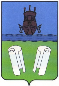 Щшп пересечен волнообразным лазуревым поясом. В верхнем лазуревом же поле галерная корма натурального цвета. В нижнем зеленом поле два серебряных свитка полотна.