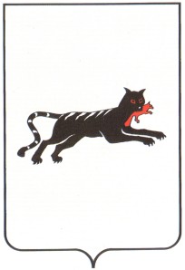 В серебряном щите бегущий хищный зверь черного цвета влево с червлеными глазами, держит во рту червленого же зверька.