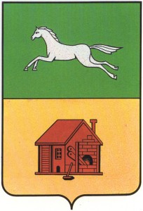 Щит пересеченный, Е верхнем зеленом поле серебряный скачущий конь. В нижнем золотом поле изображение кузницы с орудиями натурального цвета.