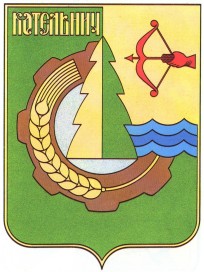 В зеленом щите серебряный круг в окружении шестерни натурального uflema, обремененной справа золотым колосом. В золотой левой вольной части выходящая червленая рука, натягивающая червленый же лук со стрелой. Оконечность вольной части лазуревая волнообразная. Поверх всего ель переменных гнетов — золотая и зеленая.
