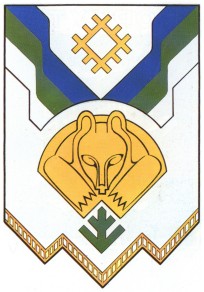 В серебряном щите опрокинутое трехкратно повторенное лазурево-зелено-серебряное ломаное усеченное стропило, которое сопровождают: внизу — стилизованный золотой медведь анфас и стилизованный же зеленый росток, а вверху — элемент национального орнамента, золотой.