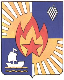 Щит четверочастный. В первой и четвертой серебряных частях сегмент золотого солнца с золотыми же лучами. Во второй лазуревой части серебряная гроздь винограда. В третьей лазуревой же части стилизованный серебряный парусник, сопровождаемый внизу двумя золотыми укороченными волнистыми поясами. Поверх всего в центре гцита стилизованные червлено-золотые языки пламени с червленой звездой.