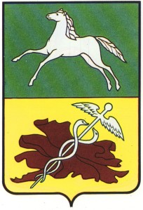 Щит пересеченный. В верхнем зеленом поле серебряный скачущий конь. В нижнем золотом поле связка, звериных шкур натурального цвета, обремененных, серебряным Меркуриевым жезлом в левую перевязь.