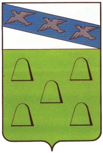 Щит пересеченный. В верхнем серебряном поле лазуревая перевязь справа, обремененная тремя летящими куропатками. В нижнем зеленом поле пять стилизованных сопок.