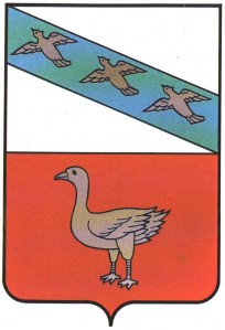 Щит пересеченный. В верхнем серебряном поле лазуревая перевязь вправо, обремененная тремя летящими куропатками натурального цвета. В нижнем пурпуровом поле стоящая птица дрохва натурального цвета.
