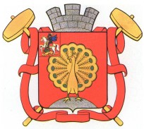В червленом щите на серебряном округлом подножии стоящий золотой павлин с зелеными блестками на перьях распущенного хвоста с червлеными глазами. В вольной части справа герб Московский. Щит увенчан стенчатою серебряною короною о трех зубцах,. За щитом два перекрещенные золотые молота, обвитые червленою Александровскою лентою.