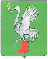 В зеленом щите стоящий на одной ноге в червленом сапожке серебряный журавль с распахнутыми крыльями держит в клюве золотой колос.