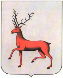 В серебряном щите идущий червленый олень, рога и копыта черные.
