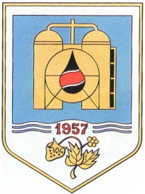 В лазуревом щите золотая стилизованная нефтеперерабатывающая установка, обремененная стилизованной же черной каплей нефти, скогиен-ной червленой волнистой перевязью с серебряной окантовкой. В серебряной волнистой оконечности щита два узких волнистых- лазуревых. пояса прерваны червлеными гулфрами 1957, сопровождаются внизу золотым кустиком земляники.
