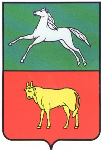 Щит пересеченный. В верхнем зеленом поле серебряный скачущий конь. В нижнем червленом поле золотой бык.