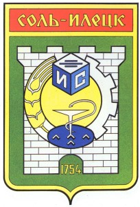 Серебряный стетатый щит с зубцами поверху окружен зеленой каймой. В центре золотой круг, обрамленный серебряной полушестерней с черной окантовкой и золотым колосом с таковой же окантовкой. Все обременено: вверху — стилизованным серебряно-лазуревым кристаллом соли с литерами ИС, внизу — лазуревым овалом (озером) с серебряной чашей, обвитой змеей. В подножии щита золотые цифры 1754. В червленой вершине щита название города золотом.
