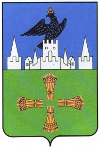 Щит пересеченный. В верхнем лазуревом поле серебряная крепость с башнями и сидящим на центральной богине черным орлом в золотой короне. В нижнем зеленом поле четыре золотые снопа, положенные крестообразно.