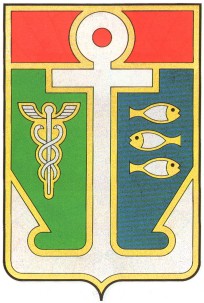 Щит рассеченный с главой. В правом зеленом поле серебряный, окаймленный золотой кадуцей, в левом лазоревом поле три противоплывущие серебряные, окаймленные золотом, рыбы в столб. Поверх всего серебряный, окаймленный золотом, якорь. Глава щита червленая.