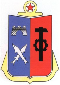 Щит рассеченный. В правом лазуревом щите серебряная крепостная башня с воротами, сопровождаемая внизу двумя серебряными же перекрещенными рыбами. В левом червленом поле черная шестерня с наложенным на нее черным же молотком. Щит украшен вверху и внизу частями золотою якоря.