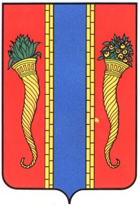 В червленом щите лазуревый столб с золотым стенчатым со швами окаймлением, сопровождаемый по сторонам двумя золотыми рогами изобилия.