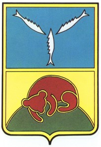 Щит пересеченный. В верхнем лазуревом поле три серебряные стерляди в виде вилообразного креста. В нижнем золотом поле медведь натурального цвета, лежащий на зеленом холме.
