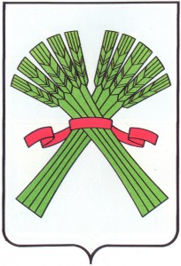 В серебряном щите два изумрудных накрест положенных снопа, перевязанных червленой лентой.