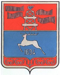 Щит пересеченный. В верхнем червленом поле стилизованная серебряная нефтяная вышка с лазуревым пламенем, сопровождаемая по сторонам серебряным же северным сиянием. В нижнем лазуревом поле скачущий серебряный олень, под ним серебряные же цифры 1634. В червленом подножии щита серебряный якутский орнамент.
