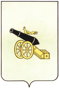 В серебряном щите черная пушка с сидящей на ней золотой райской птицей, колеса и лафет пушки золотые.