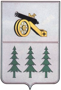 Щит пересеченный. В верхнем серебряном поле черная пушка с сидящей на ней золотой райской птицей, колеса и лафет пушки золотые. В нижнем серебряном же поле три стоящие зеленые ели.