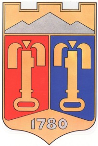 Щит рассечен червленью и лазурью. Оба поля обременены золотым стилизованным ключом-фонтаном в столб. В золотой зубчатой главе щита серебряный силуэт горы с тремя вершинами. В золотой треугольной оконечности серебряные цифры 1780.