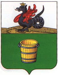 Щит пересеченный. В верхнем серебряном поле на зеленом подножии черный дракон с червлеными крыльями и червленым же языком, увенчанный золотою короною. В нижнем зеленом поле золотая бадья.