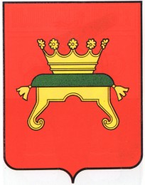 В червленом щите на золотом табурете с зеленой подушкой золотая корона о пяти зубцах.