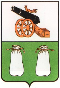 Щит пересеченный. В верхнем серебряном поле черная пушка с сидящей на ней золотой райской птицей, колеса и лафет пушки золотые. В нижнем зеленом поле два стоящих серебряных мешка, перевязанных, золотыми шнурками.