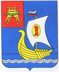 В лазуревом щите на двойном пониженном серебряном шиловидном поясе плывущая золотая старинная ладья с веслами и российским флагом. На серебряном парусе в золотом овале червленый сапожек. В правой червленой вольной части щита золотая скамья, на зеленой подушке которой золотая же корона.