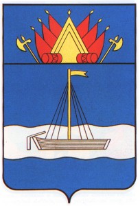 Лазуревый щит с главой. Серебряный волнистый пониженный пояс обременен стилизованным плывущим дощаником с золотой мачтой. В главе щита выходящая золотая пирамида, сопровождаемая золотыми же алебардами, червлеными барабанами и выходящими червлеными же знаменами.