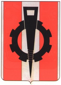 В червленом щите серебряный столб. Поверх всего черная шестерня, обремененная черным же отбойным молотком в столб.