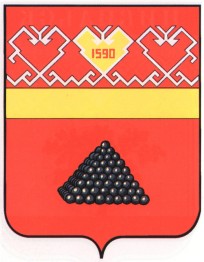 В червленом гците с повышенным золотым поясом пирамида из черных ядер. В червленой же главе щита серебряные фигуры чувашского орнамента: в центральной — на золотом поле червленые цифры 1590.