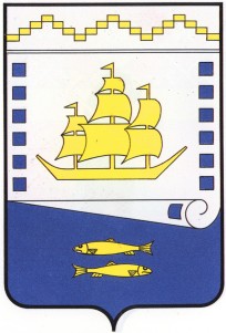 Щит пересечен серебром и лазурью. В верхнем поле золотой парусник сопровождается по сторонам лазуревыми квадратами в кайму. В нижнем поле две противоплывущие золотые рыбы. В серебряной вершине золотой юродчатый пояс.